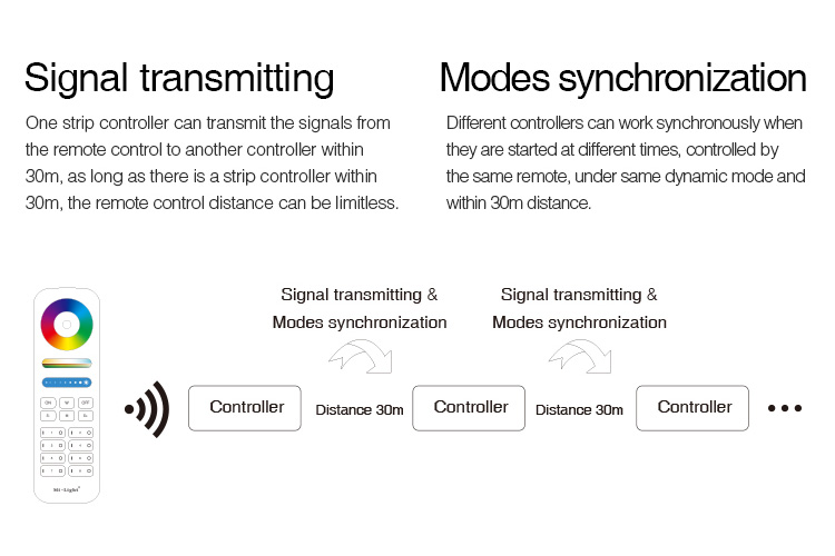 Dank der 2.4GHz RF-Technologie bietet der Controller eine stabile und zuverlässige Verbindung. Die Modulationsmethode GFSK sorgt für eine reibungslose Kommunikation zwischen dem Controller und den gesteuerten Geräten. Mit einer Übertragungsleistung von 6dBm und einer Steuerungsreichweite von bis zu 30 Metern können Sie Ihre Beleuchtung bequem aus der Ferne steuern.