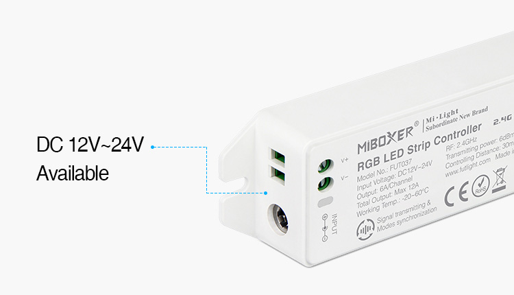 Der 2.4GHz 4-Zone RGB LED Strip Controller arbeitet mit einer Betriebsspannung von DC12V~24V, was ihn vielseitig und kompatibel mit einer Vielzahl von LED Strips macht. Mit einer maximalen Ausgangsleistung von 6A pro Kanal und einer Gesamtausgangsleistung von 12A können Sie mehrere Strips gleichzeitig steuern und anpassen, um die gewünschte Lichtstimmung zu schaffen.