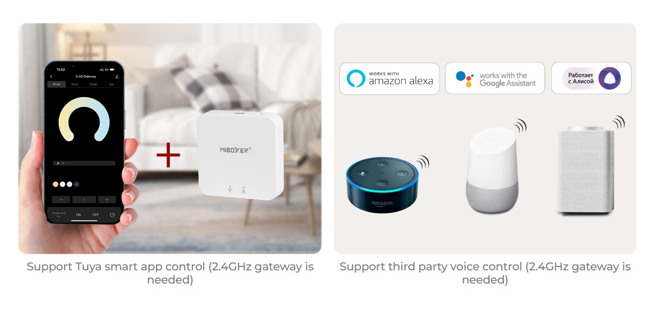 Support Alexa, Google Assistant, Yandex Alice (2.4GHz gateway is needed).