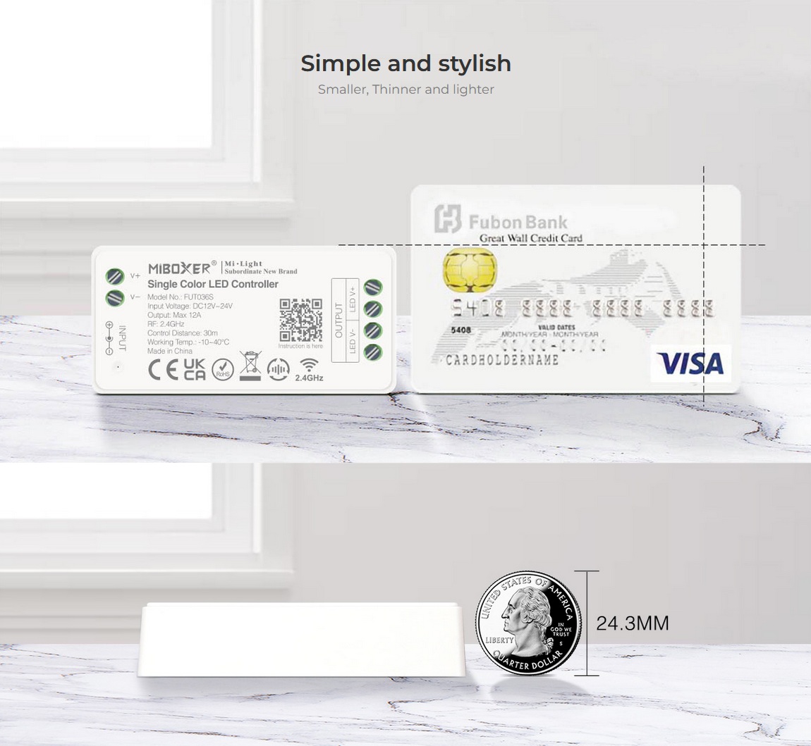 Der FUT036S LED-Controller ist die ideale Lösung für smarte Lichtsteuerung mit einfarbigen LED-Strips einfach, zuverlässig und flexibel.