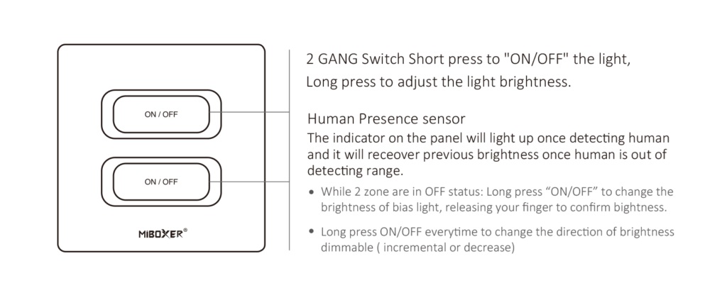 Das elegante Wandpanel verfügt über zwei Tasten, die nicht nur das Ein- und Ausschalten ermöglichen, sondern auch die Helligkeit per Langdruck stufenlos dimmen. Dank des integrierten Präsenzsensors leuchtet die LED-Anzeige automatisch, sobald Bewegungen erkannt werden für mehr Komfort und intuitive Bedienung.