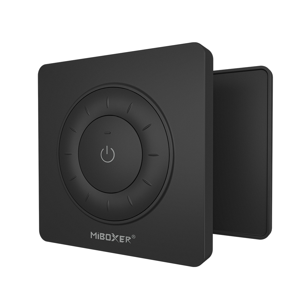 Rotating Wheel Remote, which uses the 2.4GHz frequency band, has low power consumption, long transmission distance, strong anti-interference ability, and fast communication speed. Simply turn the dial on the remote control to enjoy comfortable lighting effects. Compact, easy to use, magnetically mounted and securely attached. Can control designated Mi-Light / MiBoxer 2.4G lamps and adjust the color temperature and brightness of the light.