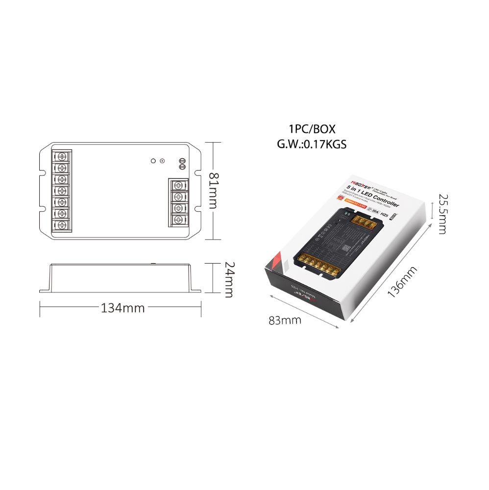 Der MiBoxer HZ5 ist ein 5-in-1 LED-Controller für Konstantspannungs-LEDs im Bereich 1248 V DC. Er unterstützt Single Color, Dual White (CCT), RGB, RGBW sowie RGB+CCT und eignet sich zur Steuerung leistungsstarker LED-Installationen im Innenbereich.