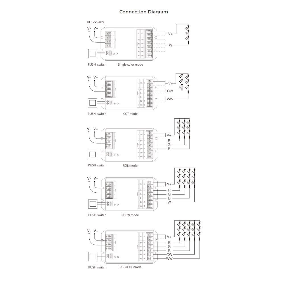 - 5-in-1 Ausgang: Single Color / CCT / RGB / RGBW / RGB+CCT