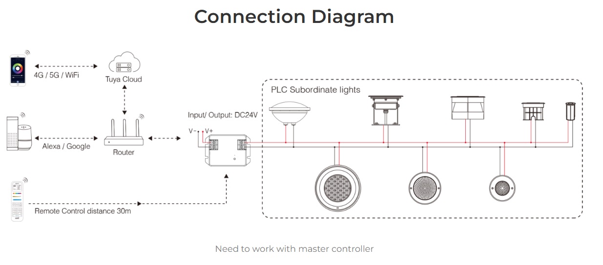Working with master controller control to dim brightness, create scenes, timer, music rhythm, biological rhythm, sleeping modeetc, support 2.4G remote control as well.