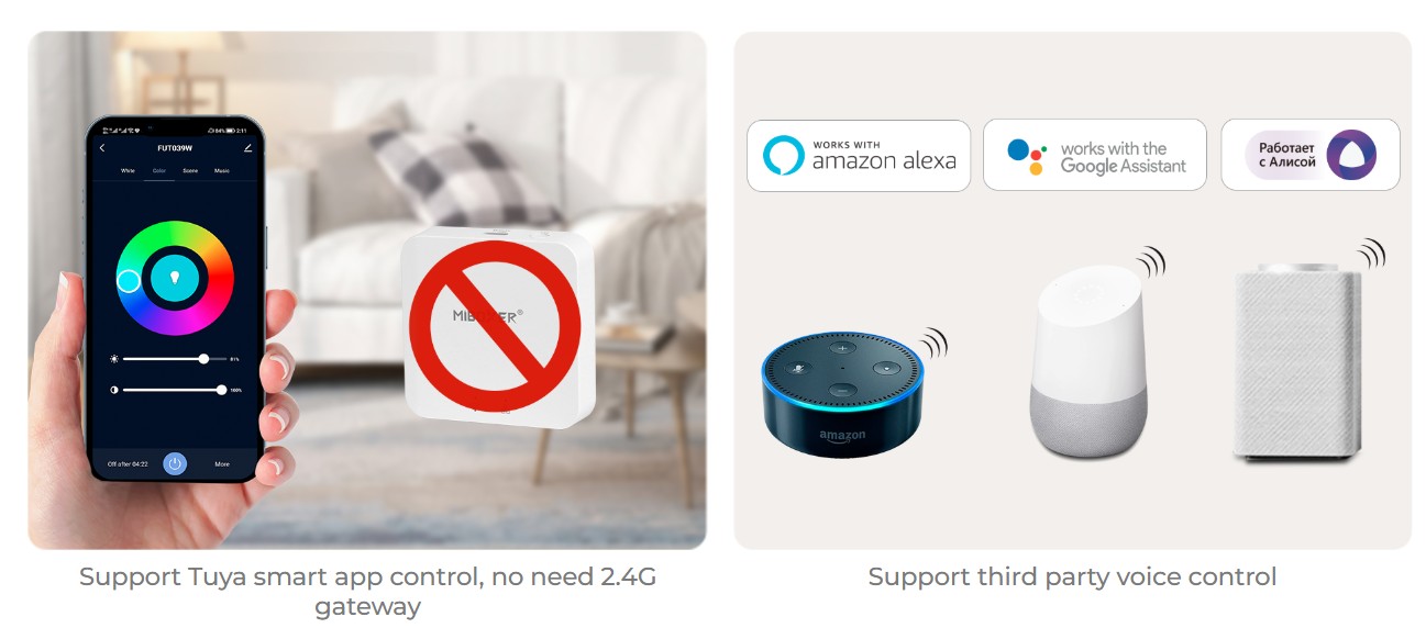- Support third party voice control like Alexa, Google assistant,Yandex Alice, Tmall Genie,Baidu and Xiaomi (2.4GHz gateway is needed)