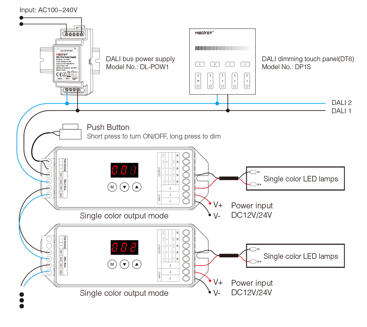 Der MiBoxer DL-X ist ein DALI-2 LED-Controller (DT8) für Konstantspannungs-LEDs im Bereich 12–24V DC. Er unterstützt fünf Ausgangsmodi und ermöglicht die Steuerung von Helligkeit, Farbe und Farbtemperatur über DALI-Bus oder Push-Dimmfunktion.