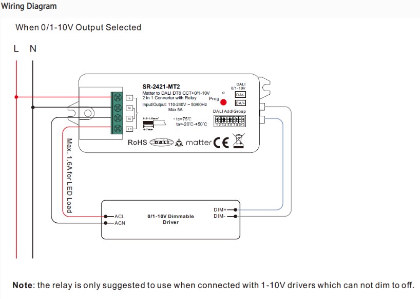 - Matter-Signaleingang, DALI-Signalausgang zur DALI-Leitung oder 0/1-10V-Signalausgang, 110-240VAC-Stromeingang