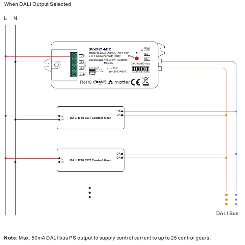 - Maximale DALI-Bus-Stromausgabe: 50mA
