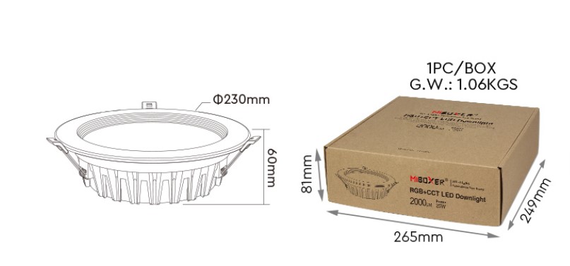 Das Downlight hat einen breiten Abstrahlwinkel von 120°, was eine gleichmäßige Lichtverteilung ermöglicht. Mit einer Steuerungsreichweite von bis zu 30 Metern können Sie die Beleuchtung bequem aus der Ferne anpassen. Der Energieverbrauch beträgt 25 kWh/1000h, was dieses Downlight zu einer umweltfreundlichen Wahl macht. Erleben Sie die Vorteile des 25W RGB+CCT LED Downlight und verwandeln Sie Ihr Zuhause oder Büro mit dieser innovativen Beleuchtungslösung.