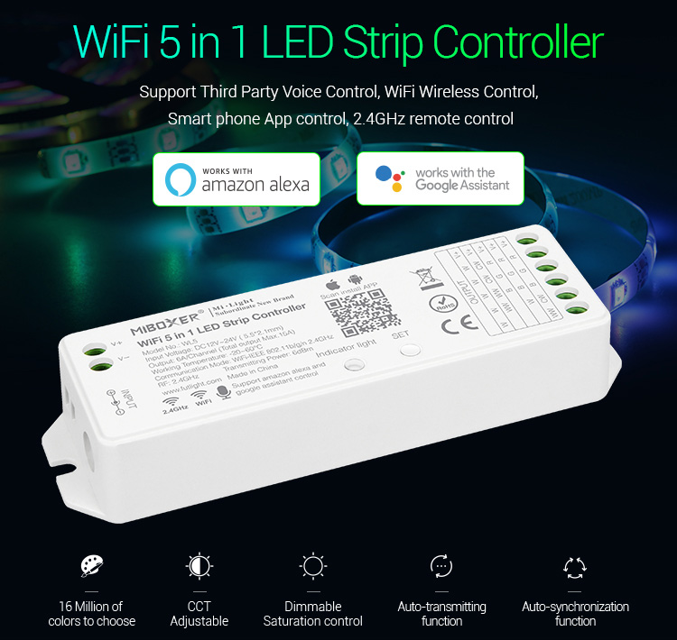 Der WiFi 5 in 1 LED Strip Controller, bietet Ihnen die ultimative Kontrolle über Ihre LED-Beleuchtung. Perfekt für moderne Wohn- und Arbeitsräume, ermöglicht dieser Controller eine einfache und flexible Steuerung Ihrer LED-Strips über WLAN.