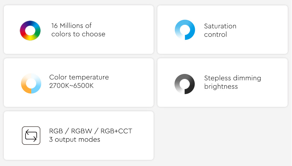 Geeignet für RGB-, RGBW- und RGB+CCT LED-Strips in Wohnräumen, gewerblichen Installationen und 2.4GHz RF Lichtsystemen.