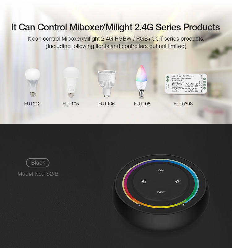 Die S2-B 2,4G Rainbow-Fernbedienung (RGB+CCT) ist ein handliches Gerät zur Steuerung von LED-Miboxer-Beleuchtungssystemen.