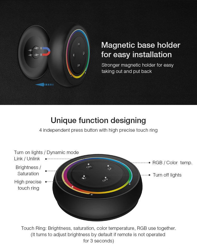 - Benutzerfreundliche Bedienung: Intuitive Tasten und ein Farbrad zur schnellen Anpassung von Farben und Helligkeit.