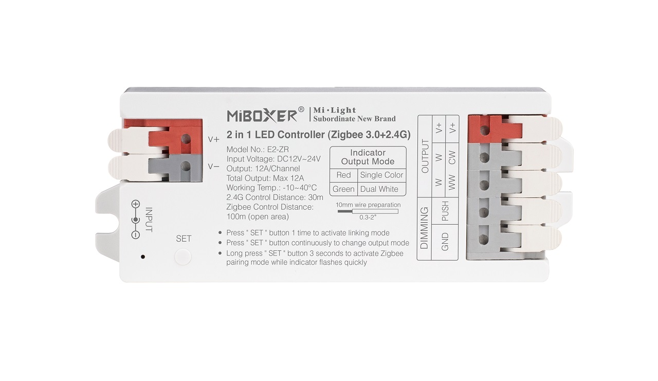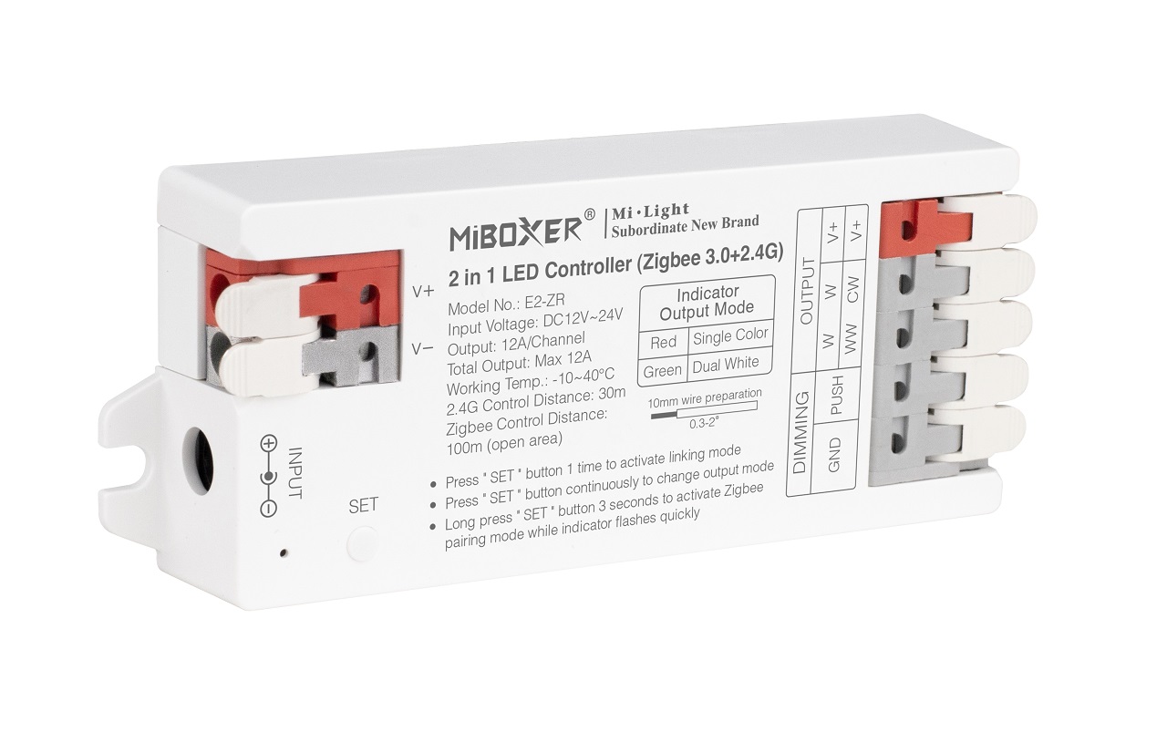 Erleben Sie die innovative Steuerung für Ihre LED-Beleuchtung mit dem 2in1 LED Controller (Zigbee3.0/2.4GHz). Dieser vielseitige Controller ist speziell für einfarbige LED-Strips und dual white (CCT) Anwendungen konzipiert und bietet Ihnen die Flexibilität, Ihre Beleuchtung genau nach Ihren Bedürfnissen anzupassen. Mit einer Betriebsspannung von DC12V~24V sorgt der Controller für eine stabile Leistung und effiziente Steuerung Ihrer Lichtsysteme.