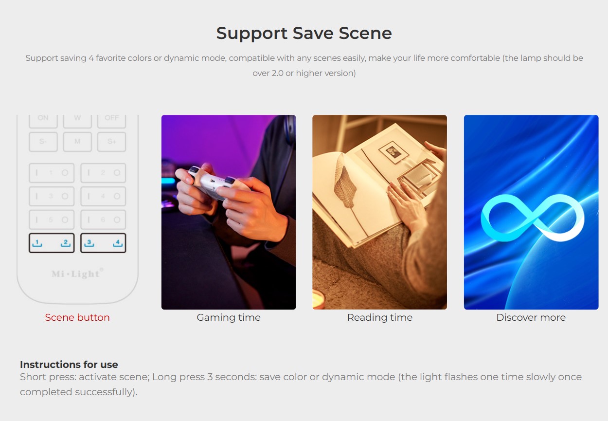 Support saving 4 favorite colors or dynamic mode (the lamp should be over 2.0 or higher version)