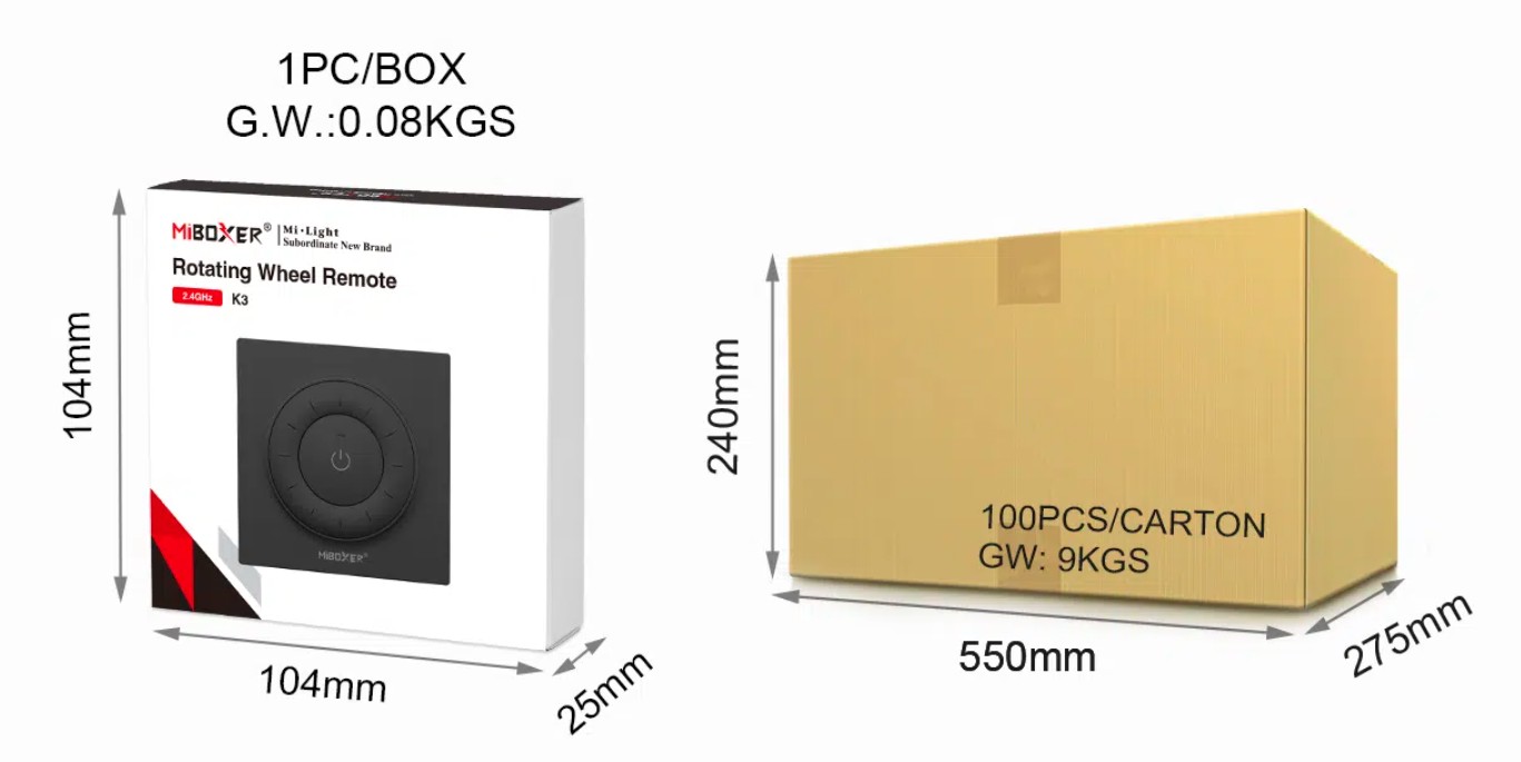 Rotating Wheel Remote, which uses the 2.4GHz frequency band, has low power consumption, long transmission distance, strong anti-interference ability, and fast communication speed. Simply turn the dial on the remote control to enjoy comfortable lighting effects. Compact, easy to use, magnetically mounted and securely attached. Can control designated Mi-Light / MiBoxer 2.4G lamps and adjust the color temperature and brightness of the light.