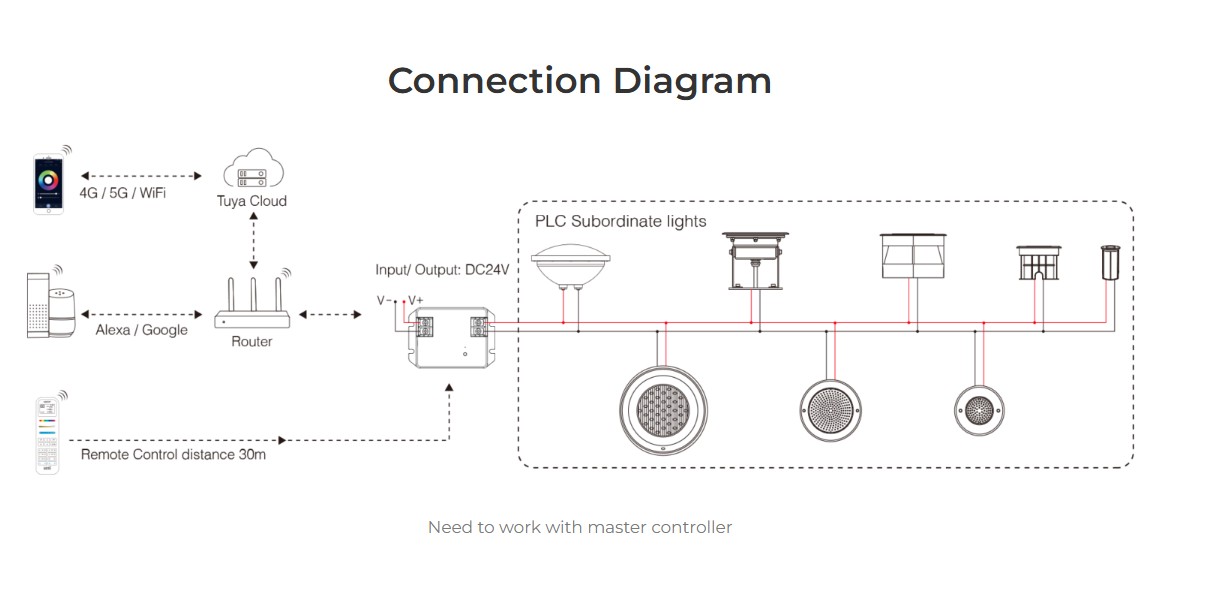 Working with master controller control to dim brightness, create scenes, timer, music rhythm, biological rhythm, sleeping modeetc, support 2.4G remote control as well.