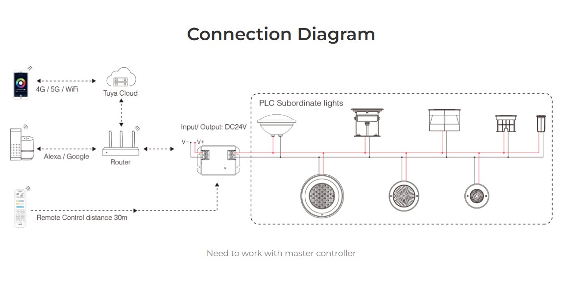 Working with master controller control to dim brightness, create scenes, timer, music rhythm, biological rhythm, sleeping modeetc, support 2.4G remote control as well.