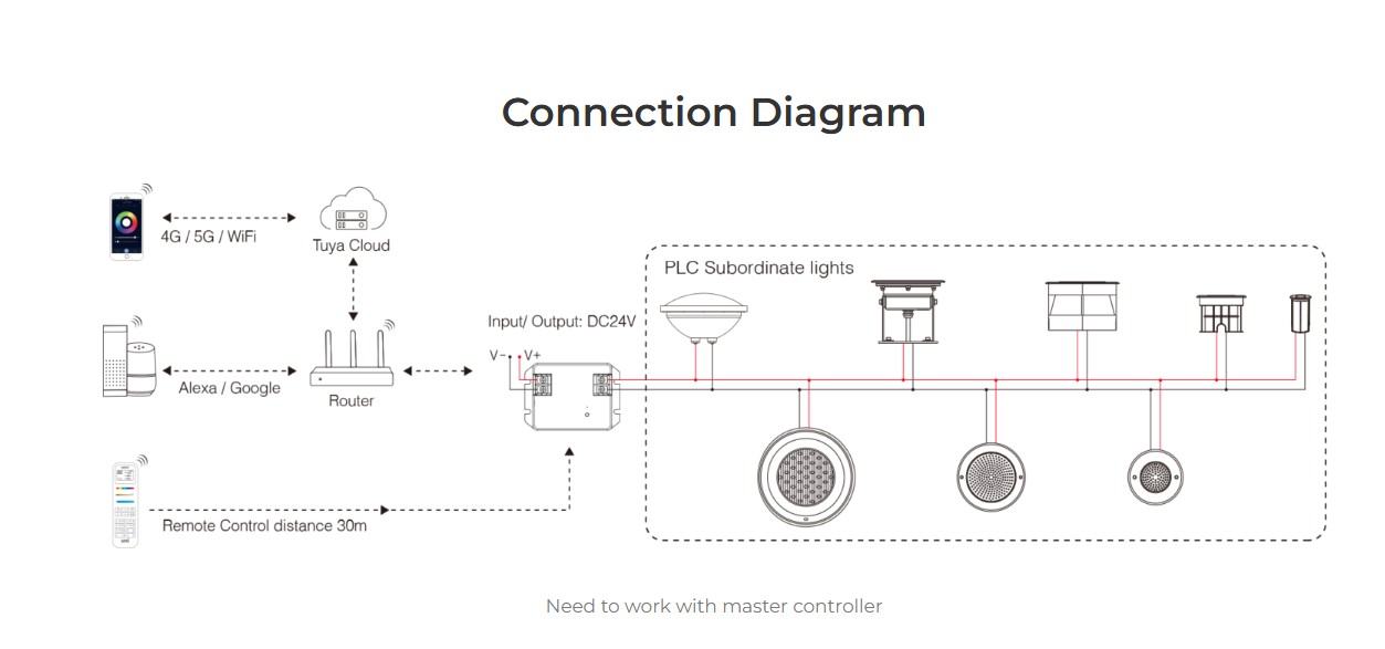 Working with master controller control to dim brightness, create scenes, timer, music rhythm, biological rhythm, sleeping modeetc, support 2.4G remote control as well.
