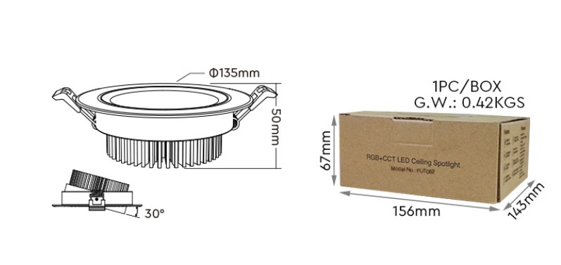 Dank der Steuerungsreichweite von bis zu 30 Metern können Sie die Beleuchtung bequem aus der Ferne anpassen. Das Downlight passt in eine Lochgröße von ø120~125mm und hat eine kompakte Größe, die eine einfache Installation ermöglicht.