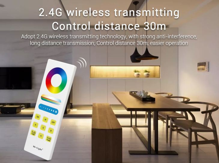 Die MiBoxer 1 Zonen RGB+CCT Fernbedienung ermöglicht die Steuerung von RGB+CCT LED-Controllern über 2.4GHz Funk. Mit Touch-Farbrad und präziser Helligkeits- sowie Weißtonsteuerung eignet sie sich für einzelne Lichtzonen im Wohn- und Gewerbebereich.