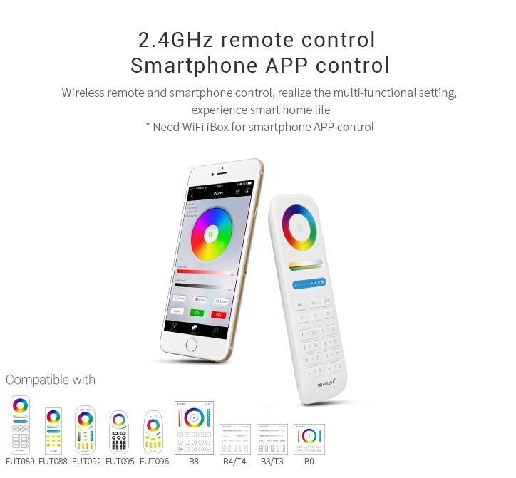 Steuerbar mit Funkfernbedienung und/oder WLAN Controller für iOS und Android, beide separat erhältlich, siehe Zubehör