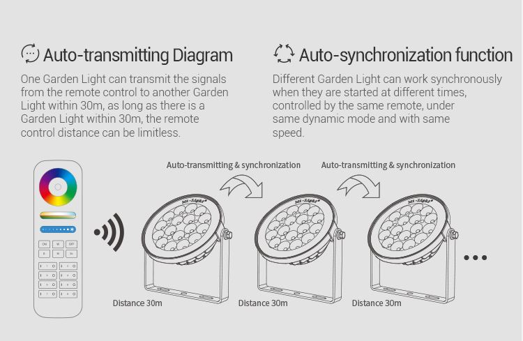 Die Gartenlampe ist steuerbar mit einer Funkfernbedienung oder einem WLAN Controller für IOS/Android - beide seperat erhältlich.