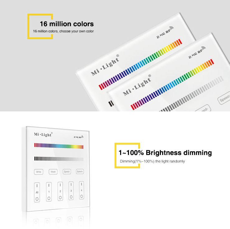 Der 4-Zone RGB/RGBW Smart Panel Remote Controller ermöglicht Ihnen nicht nur die Steuerung der Farben und Helligkeit in verschiedenen Bereichen Ihres Hauses, sondern auch die Feinabstimmung der Lichtintensität nach Ihren persönlichen Vorlieben. Er ist die ideale Lösung für alle, die eine maßgeschneiderte Beleuchtung suchen und dabei Wert auf eine benutzerfreundliche Steuerung legen. Optimieren Sie Ihre Beleuchtungskontrolle und genießen Sie die Vorteile des 4-Zone RGB/RGBW Smart Panel Remote Controllers