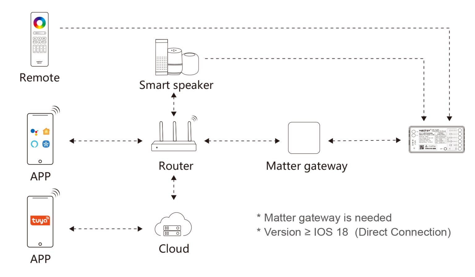 Die Einrichtung erfolgt einfach per QR-Code. Der Controller ist kompatibel mit Apple Home, Amazon Alexa, Google Home, SmartThings und Tuya. Zusätzlich kann die Steuerung über kompatible 2,4 GHz Fernbedienungen erfolgen. Eine stabile Funkverbindung mit bis zu 30 Metern Reichweite wird unterstützt.