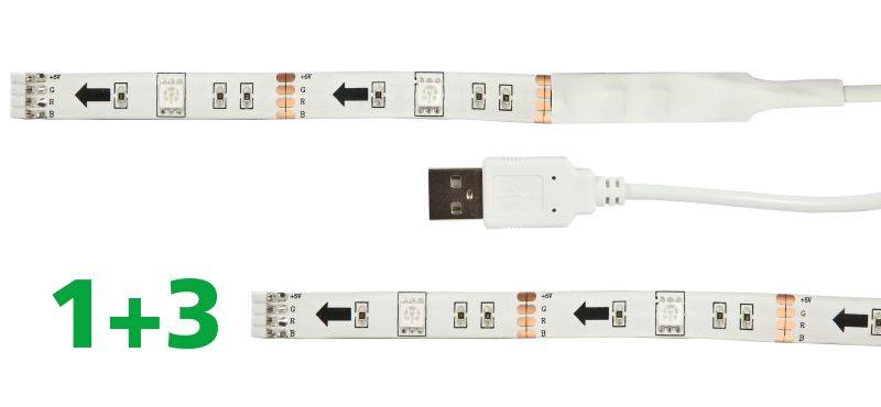 Retail komplett Set 2m RGB Strip inkl. USB Anschluß, Controller und IR-Fernbedienung in ansprechender und umweltfreundlicher Verkaufsverpackung.